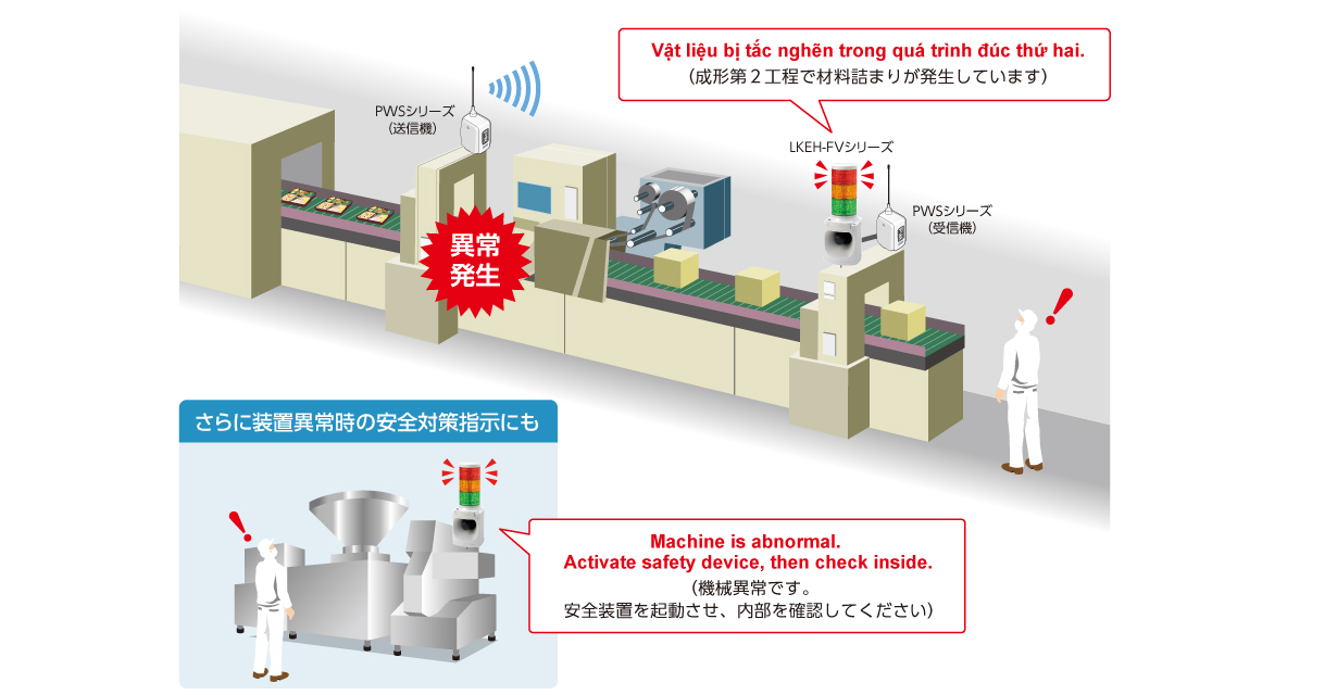 外国人労働者にも分かりやすい多言語音声による異常報知 お客様の課題 外国人労働者の採用が進んでいるが、設備異常を示す表示灯の意味が正確に伝わらず、対応の遅れやトラブルの原因となることがある。 パトライトのご提案 異常発生時には光と多言語音声ですぐに伝え、誰でも状況を把握できる環境をつくることで、トラブル対応のスピードが向上し、外国人労働者の不安軽減にもつながる。 システムイメージ 【LKEH-FV/PWS】無料サンプル貸出サービスはこちら 【PWS】購入はこちら PATLITE SHOP 使用製品 LKEH-FV 積層信号灯一体型 音声合成報知器 PWS-T ワイヤレス コントロール ユニット 送信機・受信機(省エネ版) PWS-H ワイヤレス コントロール ユニット 送信機・受信機(高速版)
