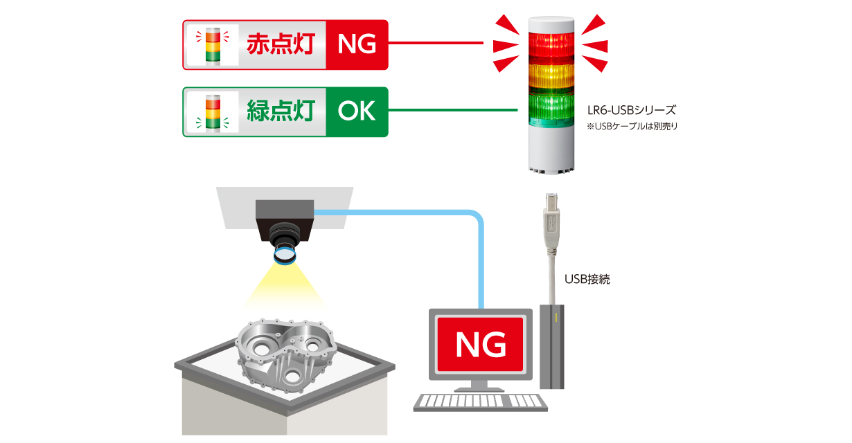 検査工程のポカよけ お客様の課題 OK/NG判定をPC画面表示しているが、見落とすことがあり不良品が流出してしまう。 パトライトのご提案 OK/NG判定が光と音でできるので作業しながらでも気づくことができ、見落とし防止につながり、不良品の流出防止ができます。 システムイメージ 無料サンプル貸出サービスはこちら 購入はこちら PATLITE SHOP 使用製品 LR6-USB 積層信号灯(Φ60mm)(USB制御)シグナル・タワー®