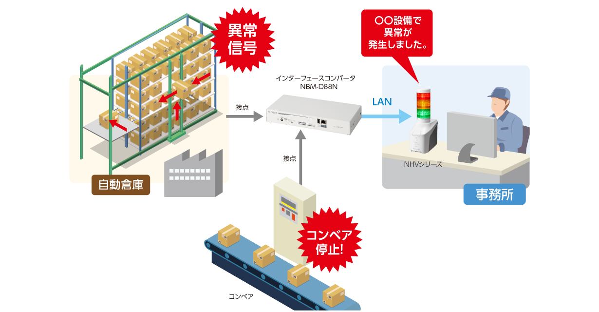 マテハン機器異常の遠隔報知 お客様の課題 自動化された設備では近くに人がおらず異常発生時にすぐ気付くことができない。 パトライトのご提案 異常信号をインターフェースコンバータで受取り、LAN経由で離れた事務所や詰所へ報知。素早く対処を行うことでロスを最小限に抑えることができる。 システムイメージ 【NBM/NHV】無料サンプル貸出サービスはこちら 購入はこちら PATLITE SHOP 使用製品 NHV4 / NHV6 ネットワーク制御信号灯(テキスト音声合成対応) NBM インターフェースコンバータ