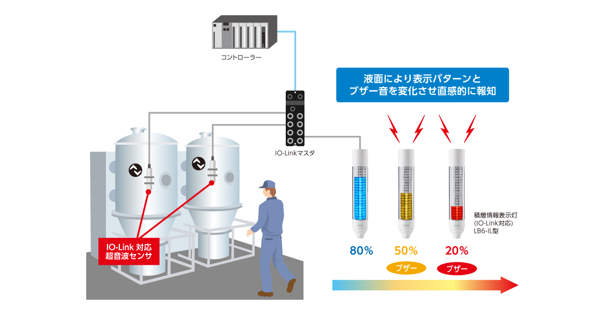タンク残量の見える化 お客様の課題 タンク残量の確認は、現場まで行ってゲージなどの目視確認が必要で確認作業に時間がかかっている。 パトライトのご提案 タンク液面高をIO-Link対応の超音波センサで検知。マスタを介してIO-Link対応表示灯で20段階の細かな残量をリアルタイムで表示可能。タンクから離れた位置からでも十分視認でき確認作業の手間を省ける。 システムイメージ 【LB6-IL】無料サンプル貸出サービスはこちら 【LB6-IL】購入はこちら PATLITE SHOP 使用製品 LB6-IL 積層情報表示灯 (IO-Link対応)