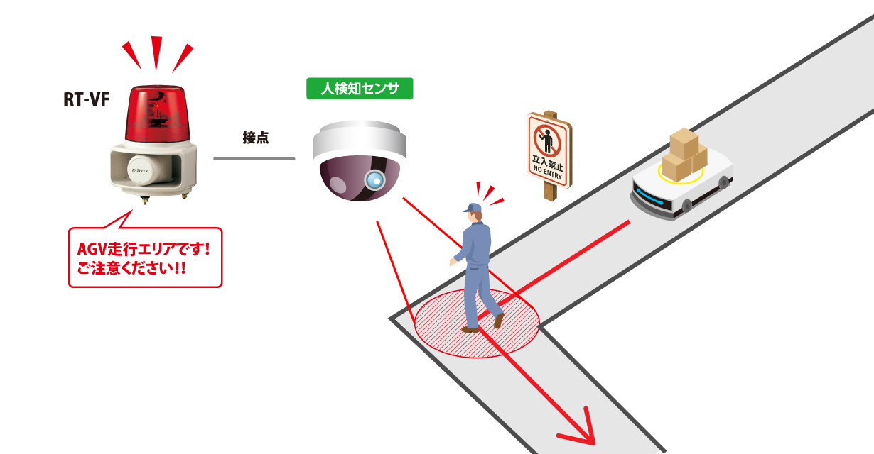 AGV走行エリアの侵入検知 お客様の課題 JIS規格に則り、AGV走行危険エリアへ「立入禁止」看板を設けているが、現場に慣れていない作業者が看板に気付かず侵入してしまうことがありAGVとの接触の危険がある。 パトライトのご提案 人感センサと音声一体型の回転灯を設置し、センサでエリア内への侵入を検知すると危険エリアであることを光と音で警告する。新人作業者でも危険を認識できるようになり安全対策につながった。 システムイメージ 無料サンプル貸出サービスはこちら 音声の登録方法はこちら 使用製品 RT-VF 回転灯一体型 音声合成報知器
