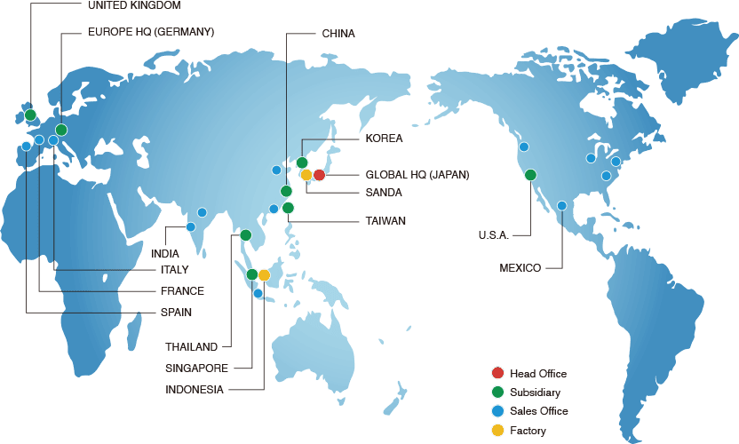 パトライトグループはアメリカ、シンガポール、中国、ドイツ、韓国、台湾、タイ、メキシコに販売会社を設立し、世界中にネットワークを構築すべく新たな販売チャネルの拡大を続けています。さらに、インドネシアの自社工場からもグローバル物流システムにより、世界中のお客様にいつでも最適なソリューションを提供できる体制を確立しています。