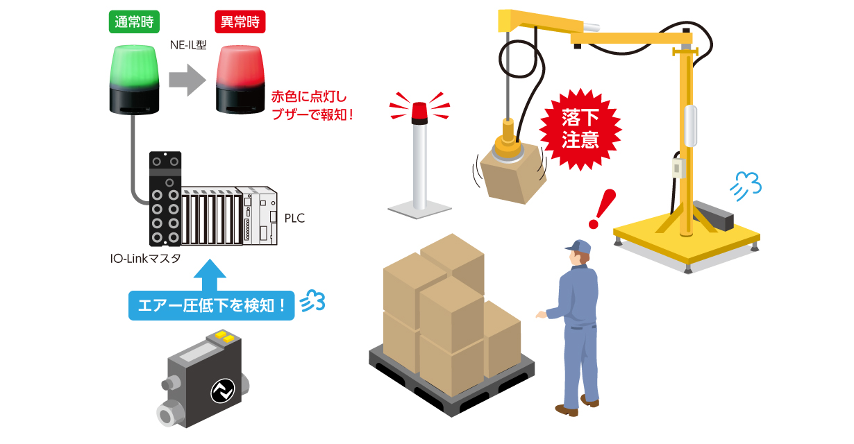 ハンドクレーンのエアー圧の状態表示 お客様の課題 重量物ワークをハンドクレーンでエアー吸着し、移動させているがエアーの供給量が適正でないと、ワークが落下し作業者のケガに繋がる危険性がある。 パトライトのご提案 エアー供給元のコンプレッサーに設置したIO-Link対応センサがエアー圧異常を検知し表示灯を緑色から赤色に変え、ワーク落下の危険を未然に防止。 システムイメージ 無料サンプル貸出サービスはこちら 購入はこちら PATLITE SHOP 使用製品 NE-IL 表示灯(IO-Link対応)