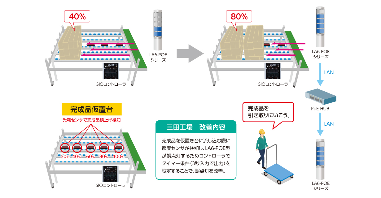 引取りタイミングの最適化 お客様の課題 今まで、梱包工程の作業者が完成品をパレットに積んでいたが、その度に作業中断ロスが発生していた。 パトライトのご提案 完成品仮置台の積載状況を見える化することで、物流担当者がタイムリーに引き取りができるようになり、梱包作業者の負担が軽減され生産性が向上した。 システムイメージ 【LA6-POE】無料サンプル貸出サービスはこちら 【LA6-POE】購入はこちら PATLITE SHOP 使用製品 LA6-POE 積層情報表示灯(Φ60)