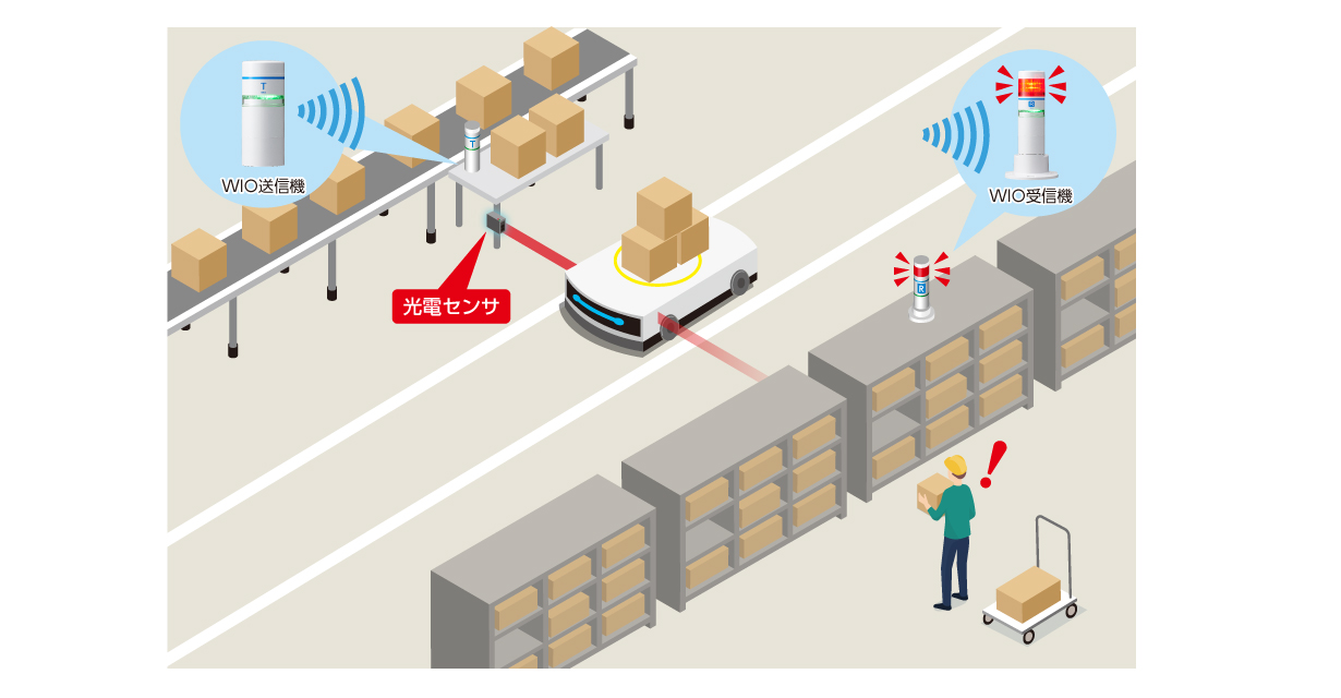 AGV人待ちロスの削減 お客様の課題 作業員がAGV到着に気付けず作業開始が遅れてしまうことがある。 パトライトのご提案 AGVが部品置き場に到着した際、無線で到着をお知らせ。 システムイメージ 【WIO】無料サンプル貸出サービスはこちら 【WIO】購入はこちら PATLITE SHOP 使用製品 WIO ワイヤレス コントロール ユニット 送信機・受信機